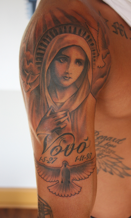 Pray greyscale tattoo done by Matt Maguire at The Compass Rose Custom Tattoo’s